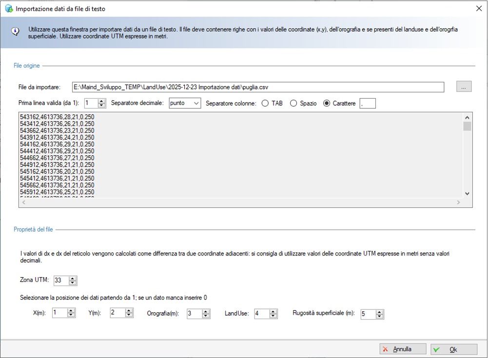 I valori di X, Y, Orografia sono obbligatori, quelli di Rugosità Superficiale e LandUse possono essere assenti.