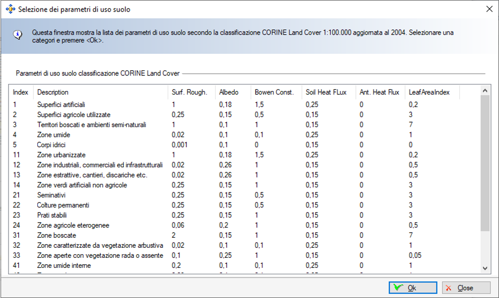 Se mancano i dati di LandUse o Rugosità Superficiale (valore 0) quando si preme Ok per effettuare l’estrazione dei dati viene visualizzata la finestra che mostra i dati del progetto Corinne Land Cover in modo da selezionare