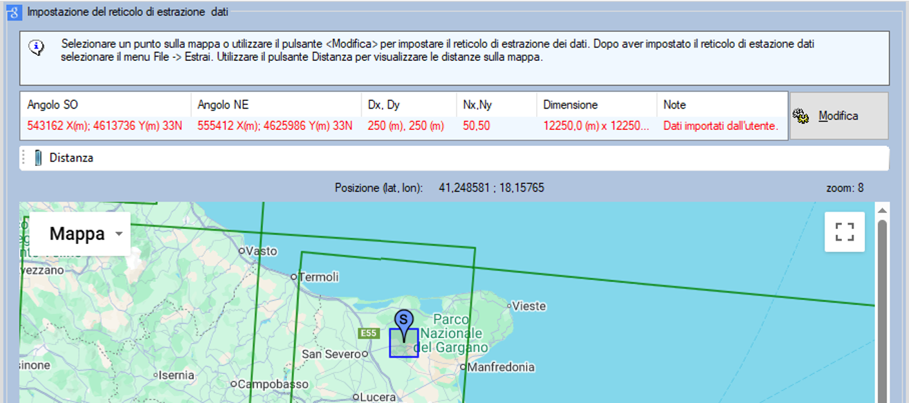Una volta estratti i dati, il box informativo riporta le caratteristiche del reticolo in colore rosso con la nota Dati importati dall’utente: